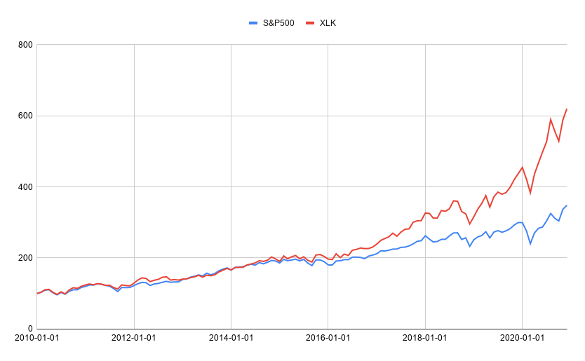 ▶현재 기술주의 강세장으로 XLK ETF의 성장성이 시장을 뛰어넘고 있습니다.
