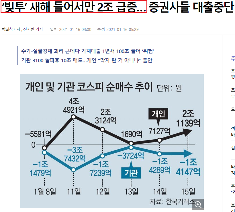 우리는 앞에서 이야기했지만 영혼까지 돈을 끌어모아 투자를 했습니다. 즉 빚을 통해 투자를 한 겁니다. 2020년까지 투자한 사람들은 그나마 다행일 수 있습니다. 왜냐하면 3월 저점 이후 코스피 지수가 정말 많이 오르긴 했거든요, 그런데 2021년에도 빚투가 이어지고 있다는 겁니다.